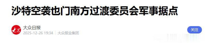 他们旗下武装还于12月3日为止了位于也门政府为止区的第二大城市赛文。 是以当前沙特才会如斯看不惯他们,在26日南边过渡委员会的队列。 其实又夺取了一处军事营地的为止权,数小时后,沙特战机就对该营地履行了3次空袭。