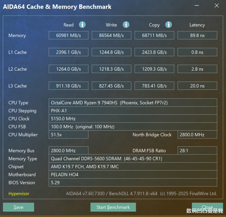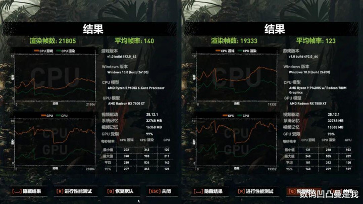 测试的台式机CPU为R5 9600X,6核16线程,磐镭HO4的CPU为R9 7940HS。确认第三方赢得的数据,R5 9600X单核性能优于R9 7940HS,但R9 7940HS的多核及核显性能则优于R5 9600X。