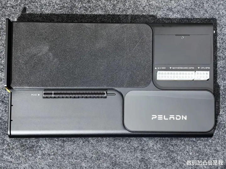 拓展坞外不雅比拟扁平,从顶部鸟瞰,可以看到程序的显卡插槽、供电线插槽,电源位置名义还有一层防刮层,兼容ATX和SFX电源。