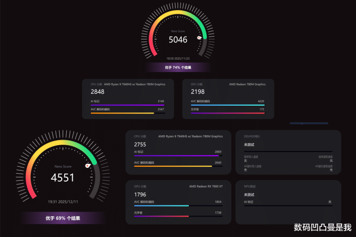 在NeroScore中,莫得外接显卡时整机得分5046分,外接显卡后得分反而降至4551分了,集合前边的PCMark10、CrossMark测试情况来看,主如果因为RX 7800 XT显卡型号比拟老,是以在部分创作场景中性能发扬还不如Radeon 780M Graphics核显。