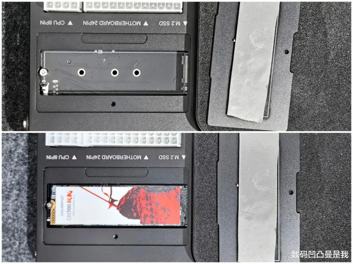 硬盘插槽是PCle3.0×1契约,扶持2280规格,同期也提供了多个其他尺寸的固定螺孔,散热贴出厂前就贴好了。