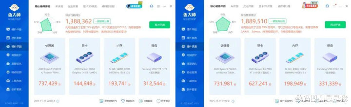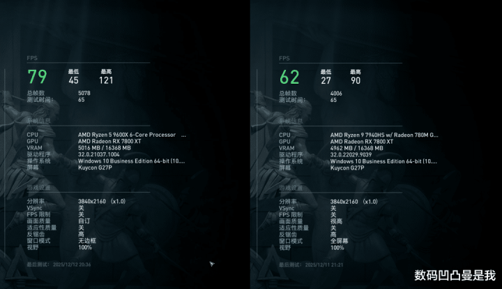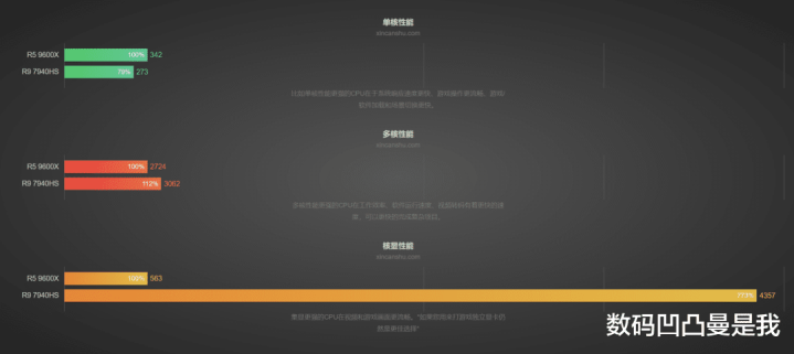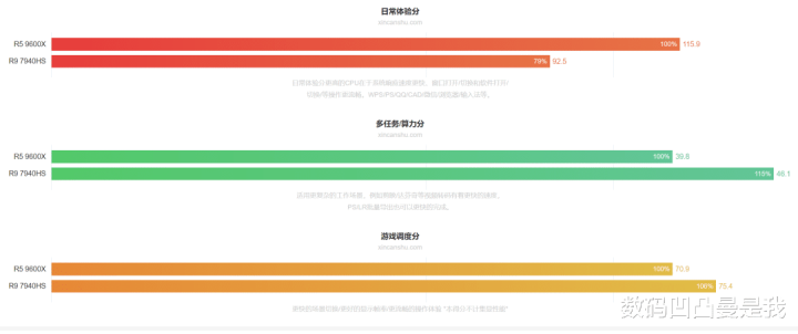 此外,在践诺使用场景中,R5 9600X日常体验分(软件掀开速率、窗口切换等)高于R9 7940HS,而R9 7940HS的多任务/算力分(视频软件转码等)和游戏调遣分(场景切换、帧率显现等)则高于R5 9600X。