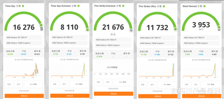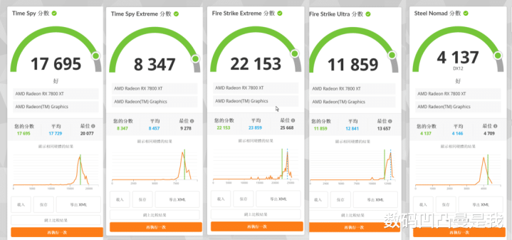 使用3DMark的TimeSpyExtreme、FireStrikeUltra、FireStrikeExtreme、SteelNomad等方式测试,测试分数如下图所示,为了便捷阅读把截图拼在一王人了,数据均为软件果然测试情况。