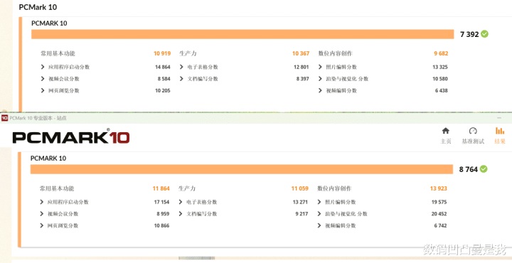 使用PCMark10测试,无外接显卡的情况下得分为7392,外接显卡后得分为8764,上升1372分。
