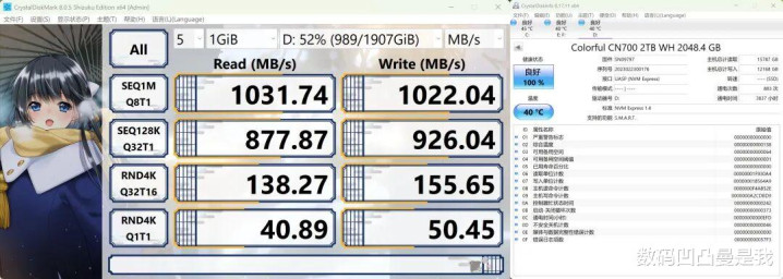 前边先容了,这款显卡坞扶持硬盘扩容,我这里装了一个PCle4.0的固态,划定读取速率为1031.74MB/s,划定写入速率为1022.04MB/s,妥贴PCle3.0×1的标称读写值。至于温度,和主机固态硬盘差未几,莫得极度过热的情况 。