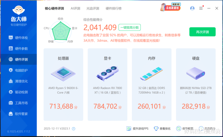 CPU属于比拟大的变量,有必要挑升诠释一下。用鲁大师跑分,R5 9600X得分比R9 7940HS要低一些,不外RX 7800 XT独显在台式机上的得分要权贵高于USB4外接显卡坞的得分。